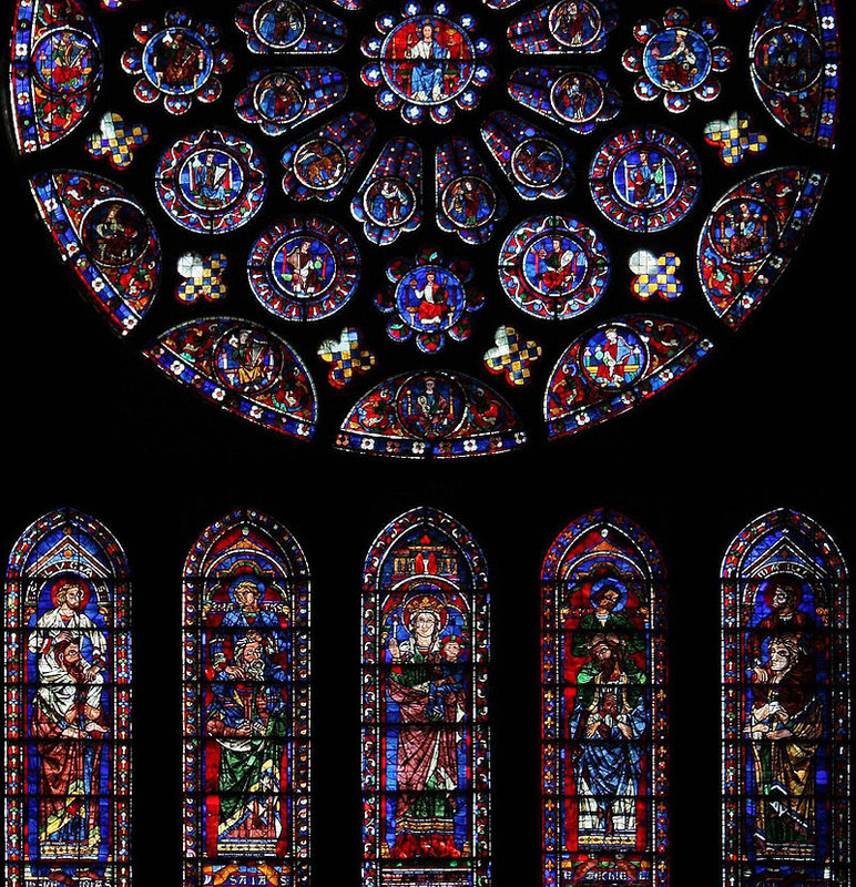 The visual image (from Bernard of Chartres) appears in the stained glass of the south transept of Chartres Cathedral. The tall windows under the rose window show the four major prophets of the Hebrew Bible (Isaiah, Jeremiah, Ezekiel, and Daniel) as gigantic figures, and the four New Testament evangelists (Matthew, Mark, Luke, and John) as ordinary-size people sitting on their shoulders. The evangelists, though smaller, "see more" than the huge prophets (since they saw the Messiah about whom the prophets spoke).